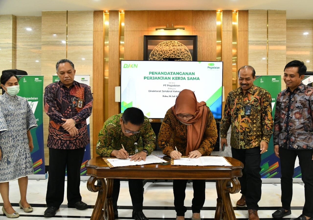 penandatanganan MoU Akurasi Data Bea Lelang antara Pegadaian dengan DJKN di Jakarta, Rabu (6/7/2022) (foto:humas pegadaian)