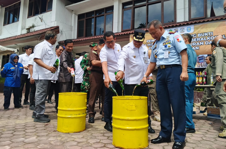 Adapun BB yang dimusnahkan diantaranya 52 unit pom mini dan 1516 botol miras dari berbagai merk. Pemusnahan dilaksanakan secara simbolis oleh Wakil Wali Kota dengan menuangkan Minuman Beralkohol ke dalam tong berisi pasir.