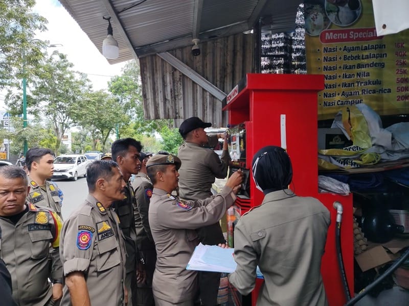 Satpol PP sedang menegakkan aturan terhadap Pom Mini yang melanggar di kawasan Stal Kuda Balikpapan (foto:iknbisnis.com/yandri)