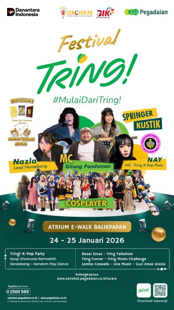 IKNBISNIS.COM, BALIKPAPAN – PT Pegadaian (Persero) menghadirkan Festival TRING di Atrium Ewalk Mall Balikpapan pada 24-25 Januari 2026. Acara yang mengusung semangat #MulaiDariTring ini dirancang sebagai wadah hiburan dan edukasi bagi masyarakat dengan beragam aktivitas menarik.